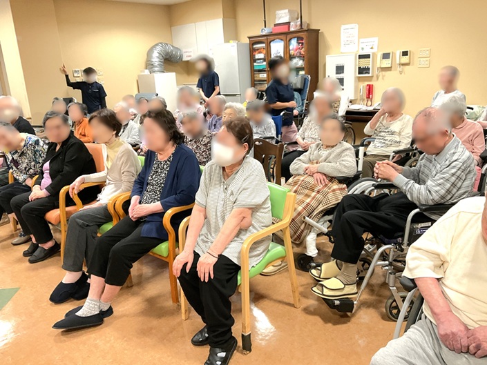 ご利用者の皆様は一階ホールに集まって子どもたちの出し物を見るのを心待ちにしています!