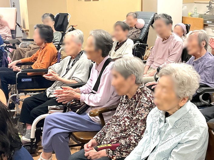 園児のダンスにうなずかれる方、笑顔で手をたたいてくださる方、しっかりと耳を傾けてくれる方などご利用者の皆様は色々な表情をされています。