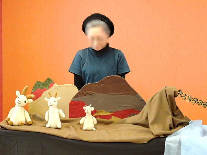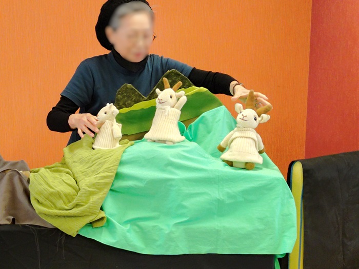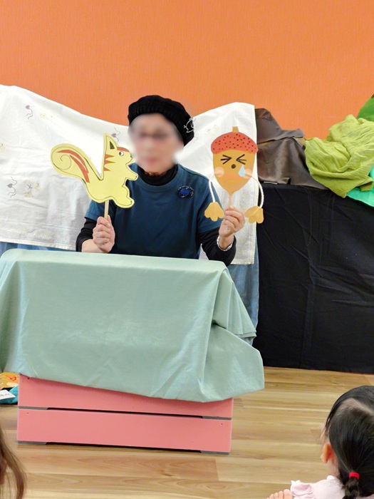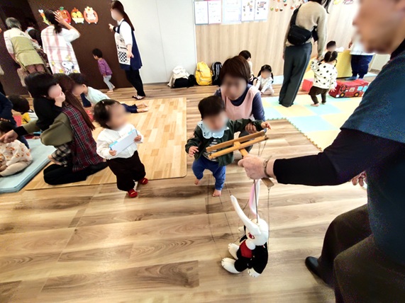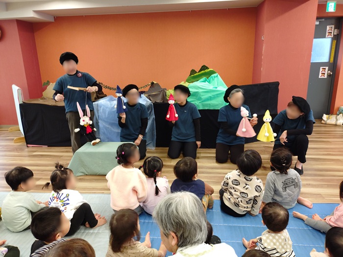 乳児対象の人形劇でしたが、人形が登場すると保育園児も地域のお友だちも真剣に見始めてお友だちとも真剣に見始めて集中していました。