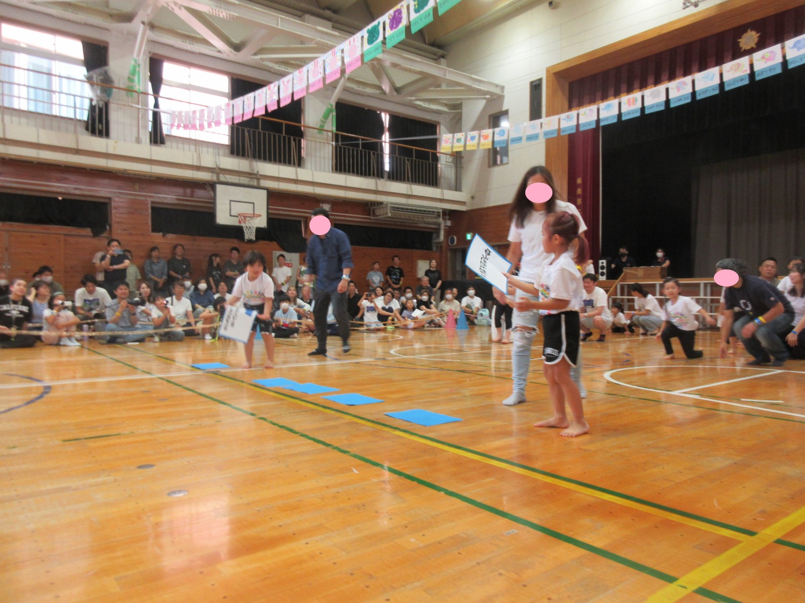 親子競技では、会場の中からお題に合った人を探してゴールを目指す「借り人競争」を行いました。