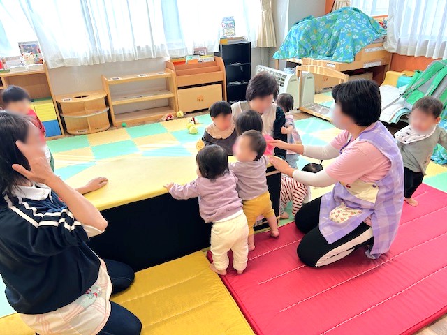 今日は「つぼみ組(0歳)」のお友達がホールを使って遊んでいました。