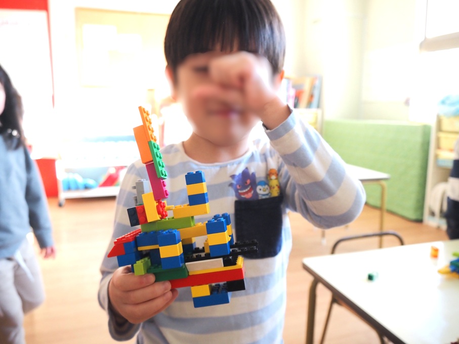 とうかいどう保育園のお友達は沢山あるブロックを重ねて思い思いの作品を作っていました。