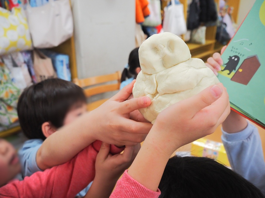 粘土を「おもち」に見立てて思い思いの形にできました。