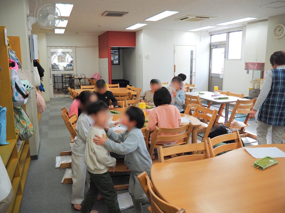 とうかいどう保育園にお伺いすると、1階のランチルームに「ぞう組(5歳児)」のお友達が座っていました。