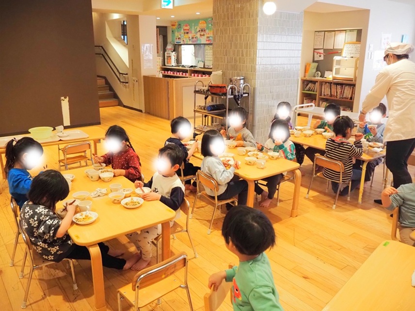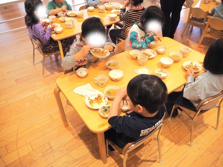 先日、用事があってとごしの杜保育園に行ったとき、ちょうどお昼ご飯の時間でお友達がご飯を食べていました。