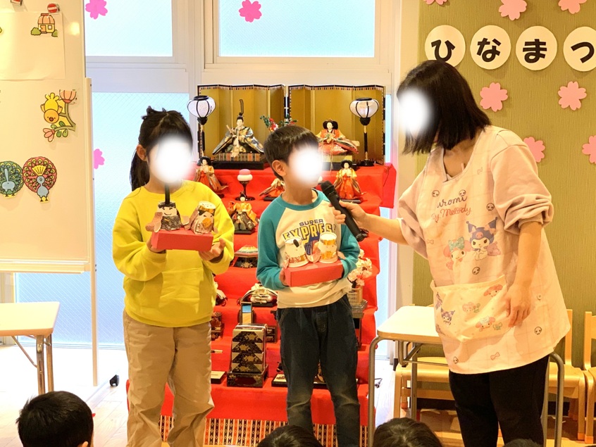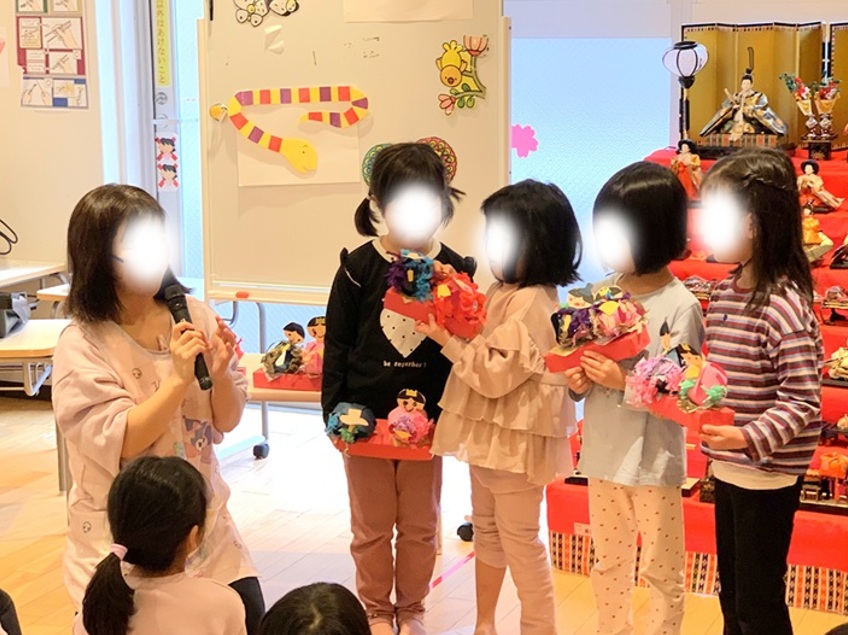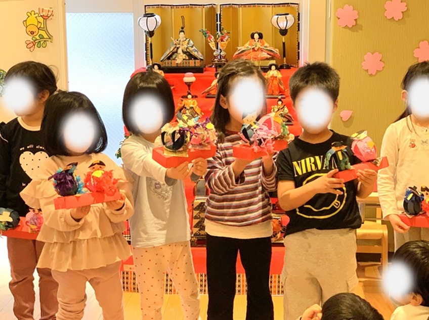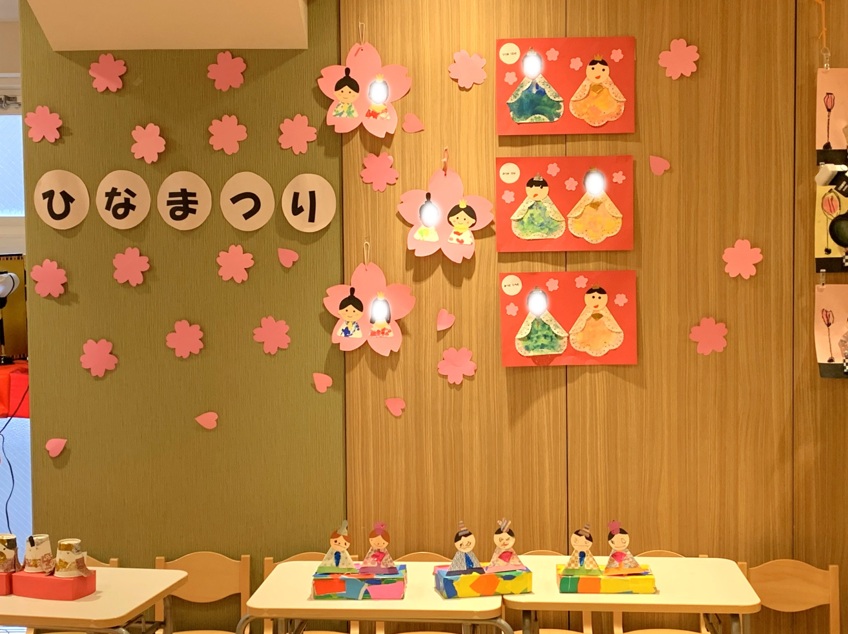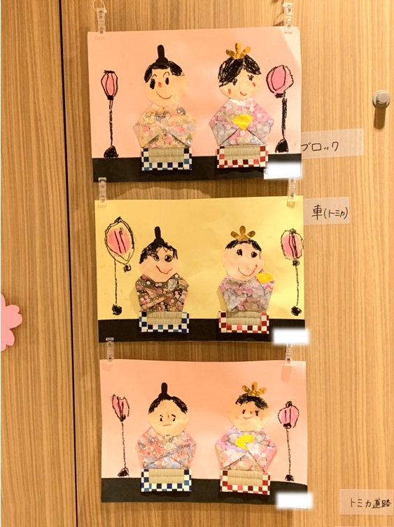とごしの杜保育園では、ひな祭りの行事をしつつ、お友達が作ったひな祭りの制作物を披露しました。
