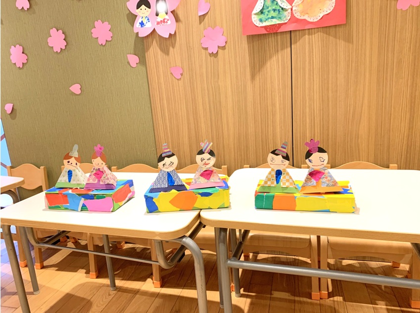 それぞれのクラスのお友達が作成したひな人形が一階食堂を華やかにしてくれています。