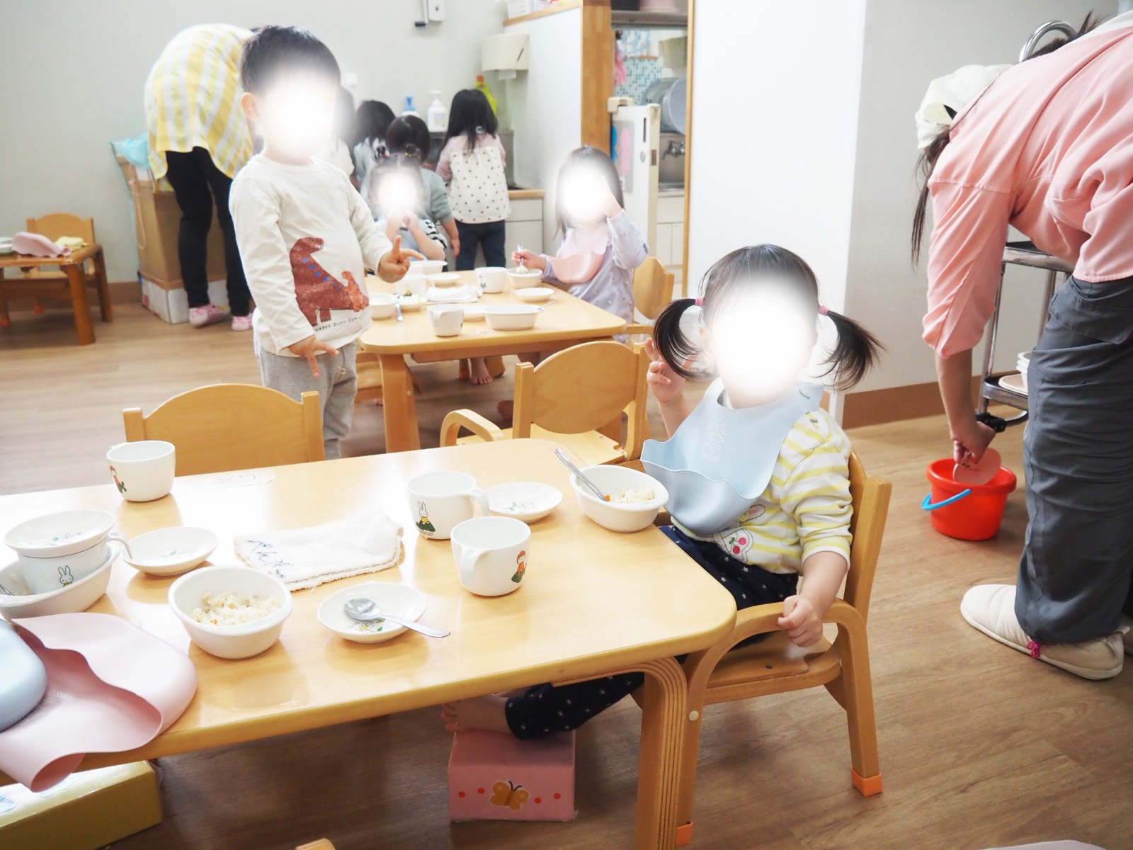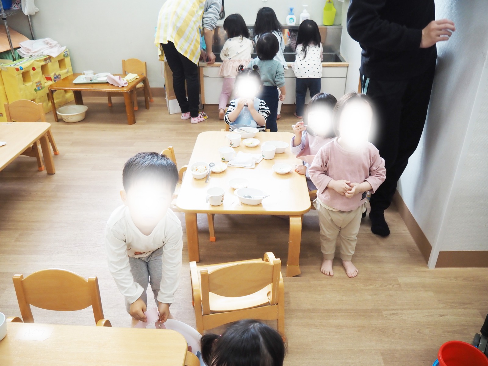 みんな椅子に座ってきちんとおやつを食べていて「しっかりしているな」って感心していると、早く食べ終えた何人かのお友達は奥の手洗い場に向かいました。