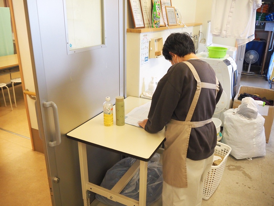 一日の作業の流れ(洗濯や納品)は利用者が主体となって計画しますが、そのバックアップとして職員が大まかな流れを確認し合っています。