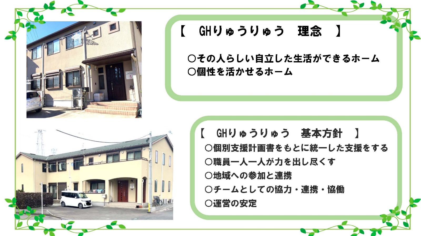 グループホームりゅうりゅうは、これからも提供されるサービスを常に見直して質の向上に努めていきたいと思います。